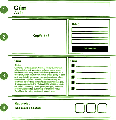 A vizuális anyag mellett, a jobb oldalon már egy kapcsolat-felvételi vagy megrendelési űrlap is helyet kap call-to-action felhívásokkal (Rendelje meg!, Kérje még ma!, Ne maradjon ki! Stb.).